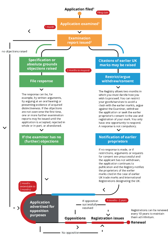 - The UK Trade Mark Registry examines the application to confirm the specification is in order and determine whether the mark is descriptive or otherwise lacks distinctiveness. The Registry will also conduct a check of existing UK trade mark applications / registrations to see if your application may conflict with these earlier rights.